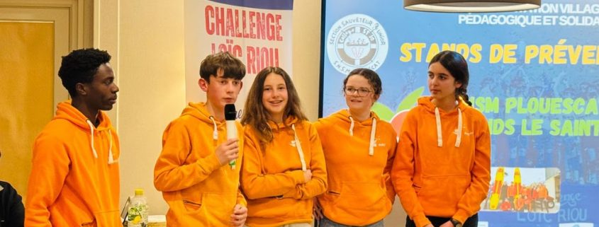 Prise de parole des jeunes du projet CCSM à l’occasion du tirage au sort des poules pour le challenge Loïc Riou, tournoi de football à Taulé le 2 mai prochain. Les élèves tiendront un stand pour former les jeunes joueurs et leurs coachs aux gestes qui sauvent et en particulier au défibrillateur.
